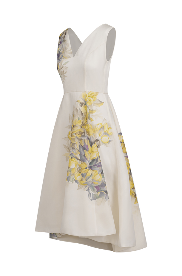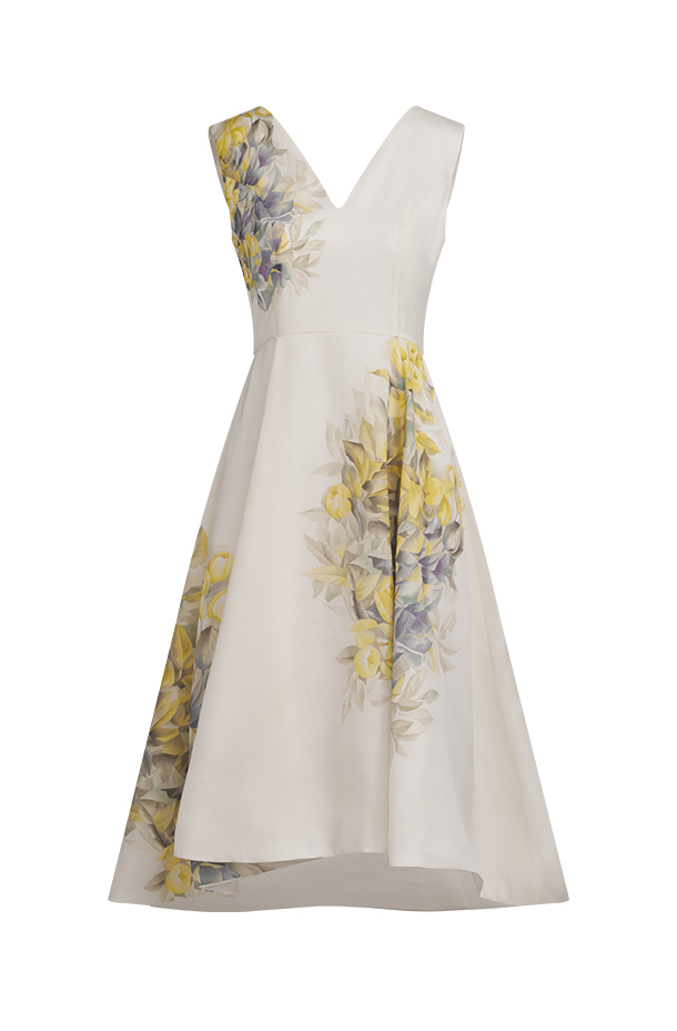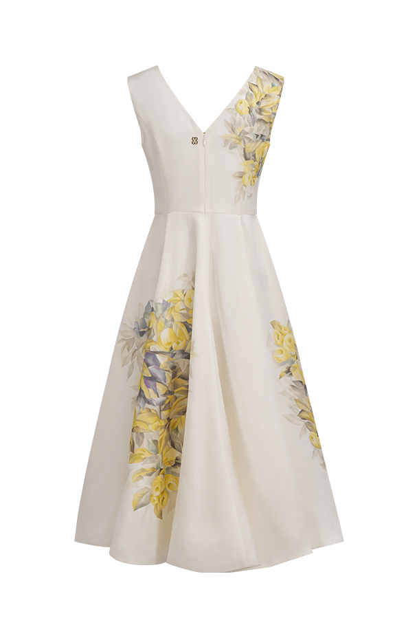 · Uses "placement printing" to highlight the gown's intricate elegance.