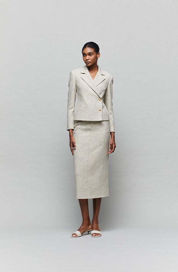· Intricate tweed texture elevates the look, with soft hues creating an elegant, sophisticated atmosphere.