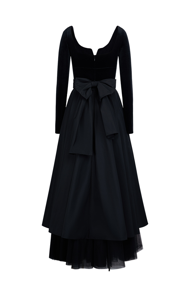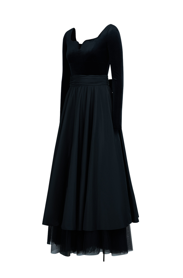 The bodice features stretch velvet, with a sweetheart neckline and long sleeves that contour the body to outline an elegant, feminine silhouette.