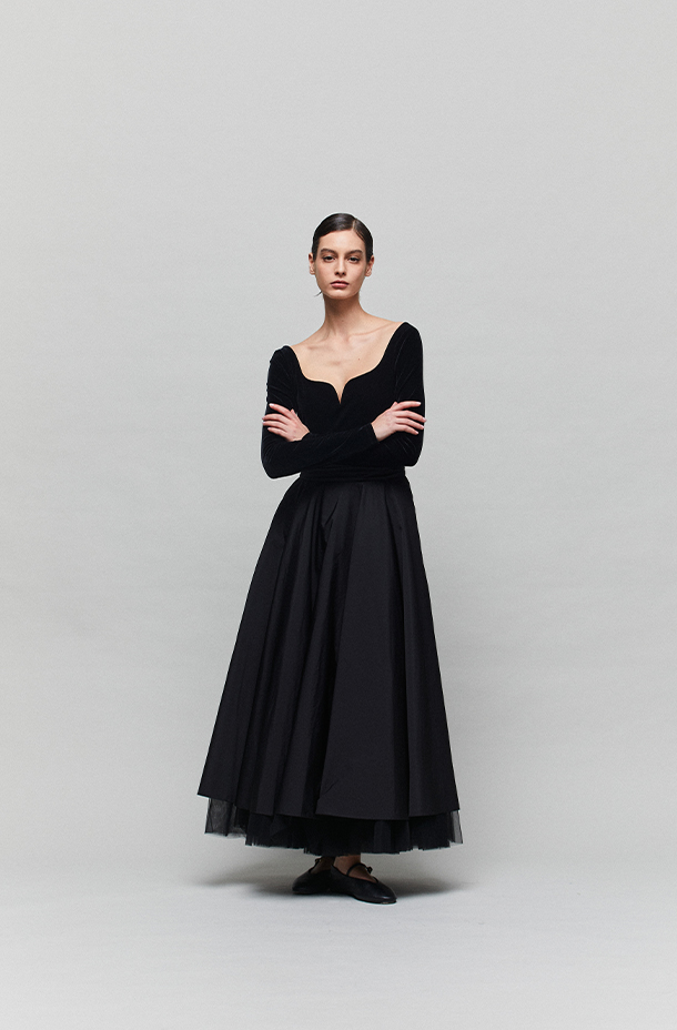 · The skirt combines a lightweight inner mesh with a structured black taffeta outer layer for voluminous, sculptural shape.