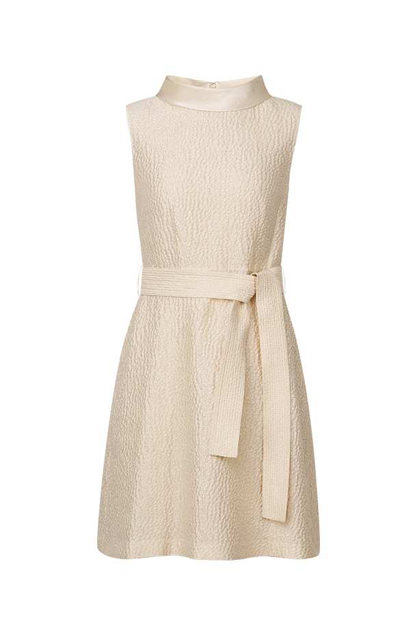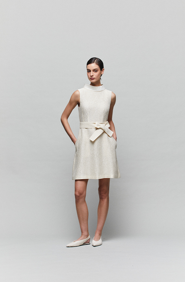 CURIEL's iconic short HEPBURN style dress with a turnover collar.· The fabric features a rippled texture with a pearlescent sheen.· A classic 1950s silhouette with clean, fluid lines.· A structured roll collar enhances the neck's graceful lines.