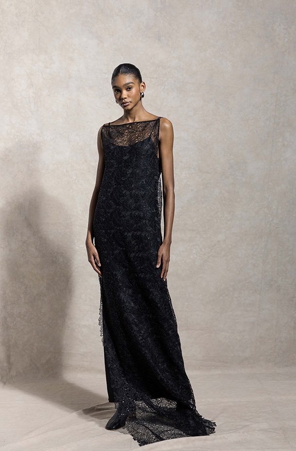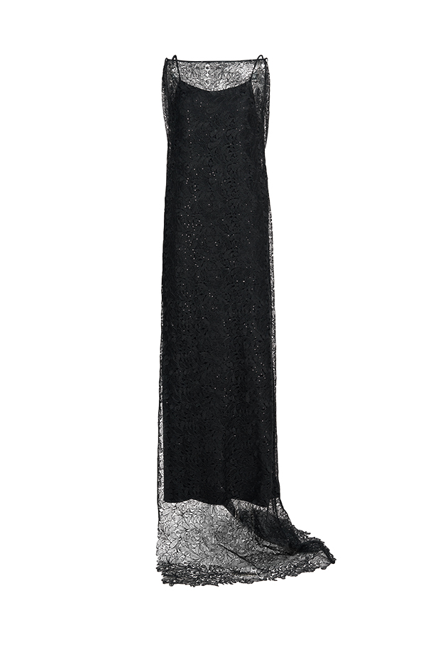 Delicate lace fabric, lightweight and romantic with distinct layers.