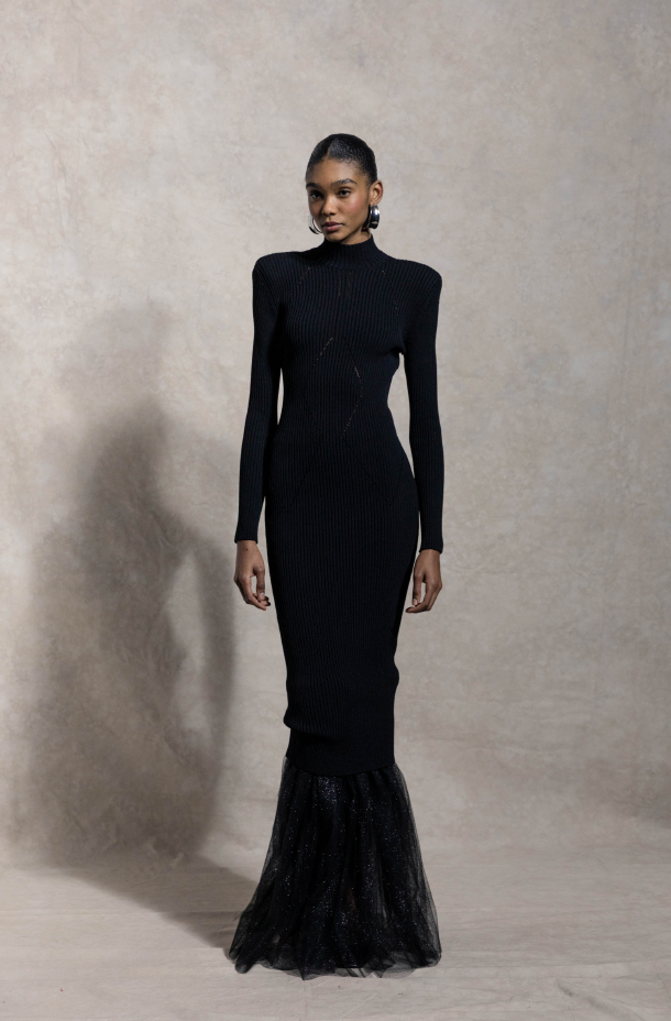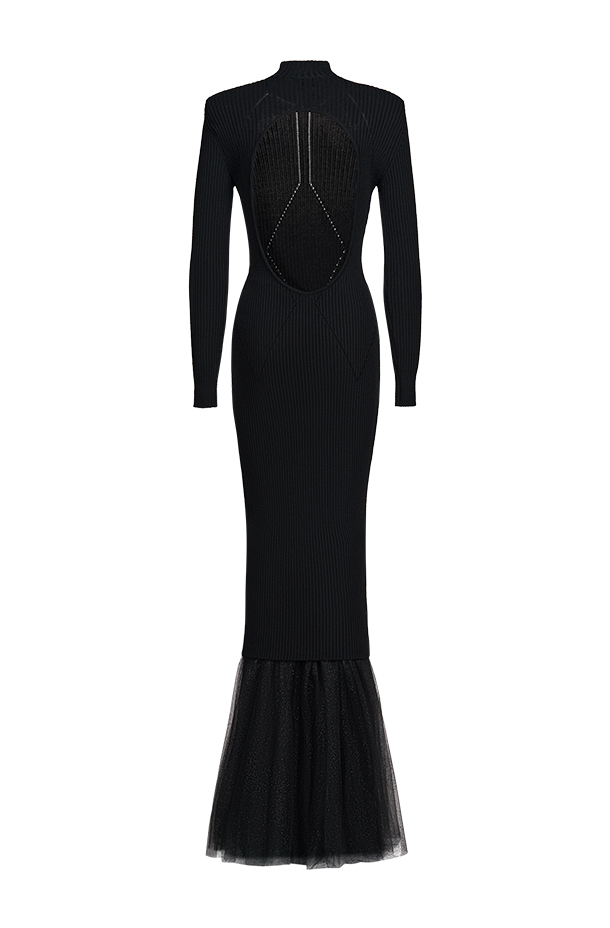 · Outer high-neck knit dress wearable alone, with back oval cutout for stylish allure.