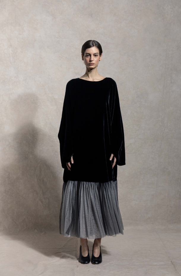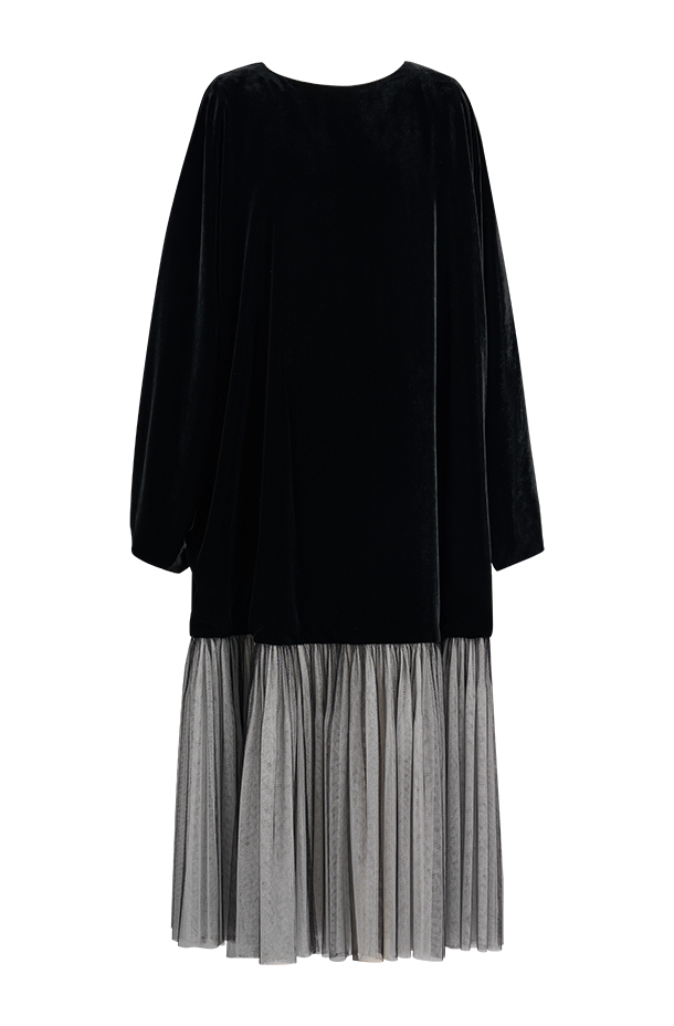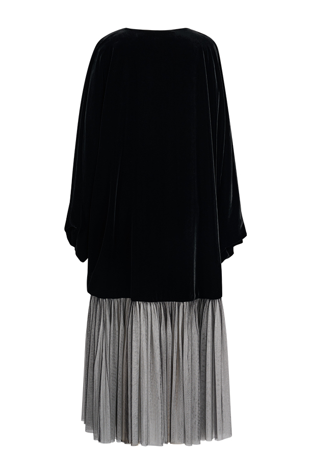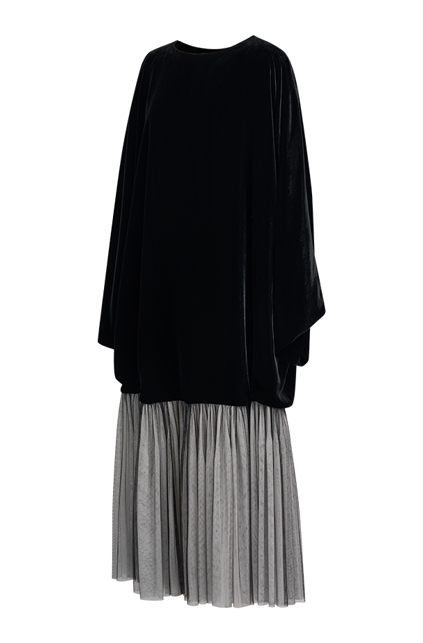 Double-faced satin upper body, smooth and warm, layered with chiffon to showcase textured richness.