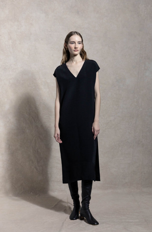 V-neck drop shoulder relaxed long black silk-blend dress.