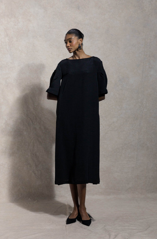 High-grade silk-blend fabric, lightweight and soft, with natural drape that outlines an elegant figure.
