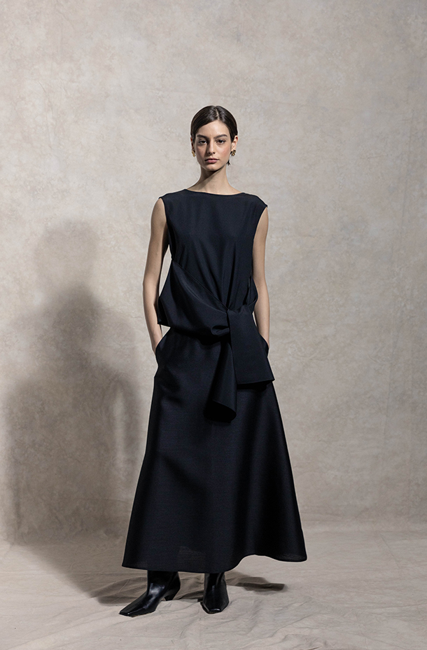 Boat neckline modifies shoulder-neck proportion, outlines sharp charm.Adjustable side ties emphasize the waist for styled shaping.Sleeveless design ideal for spring/summer layering or solo wear—office or daily.92SE 8EA