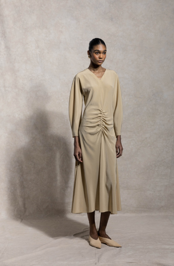 Cocoon-shaped bodice cutting with soft fluid lines, combining comfort and style.