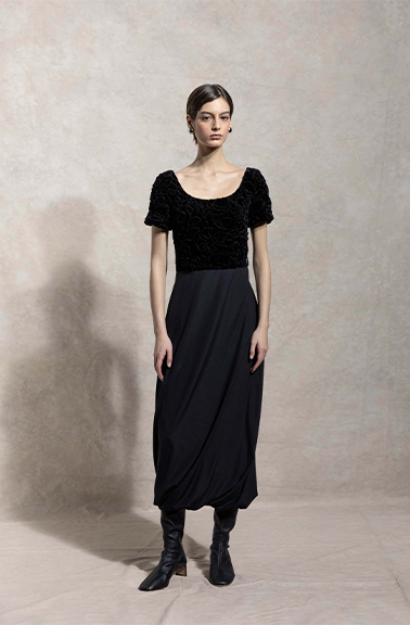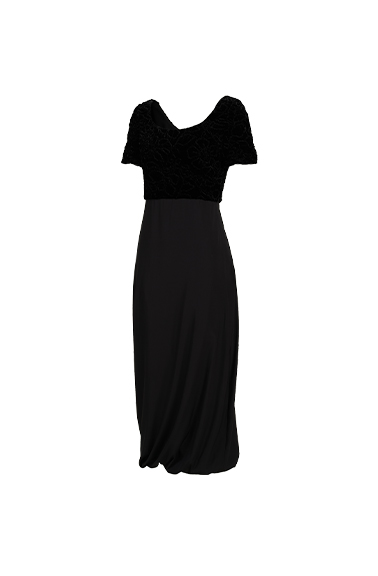 Pleated velvet bodice, smooth luster, presents dimensional layering.
