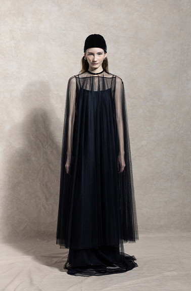 Velvet-trimmed umbrella-shaped mesh cape