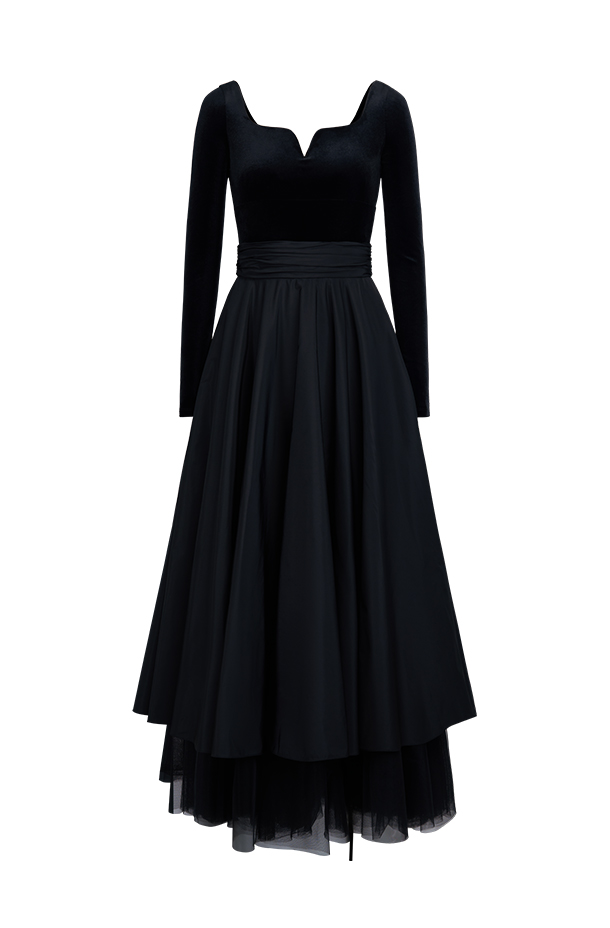 The bodice features stretch velvet, with a sweetheart neckline and long sleeves that contour the body to outline an elegant, feminine silhouette.