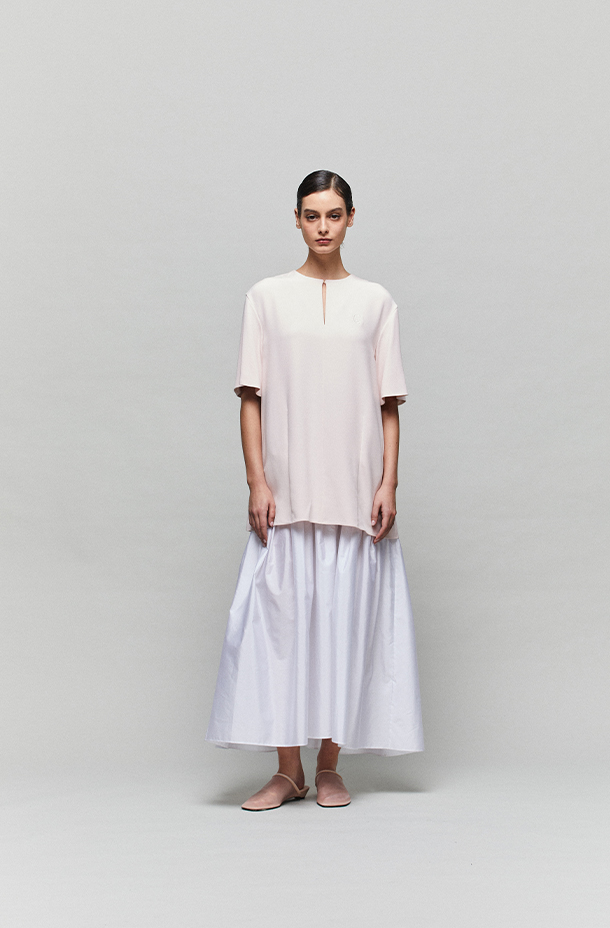 · Black and white contrast, blending premium black velvet with lightweight cotton sateen for a relaxed tee and soft pleated skirt.