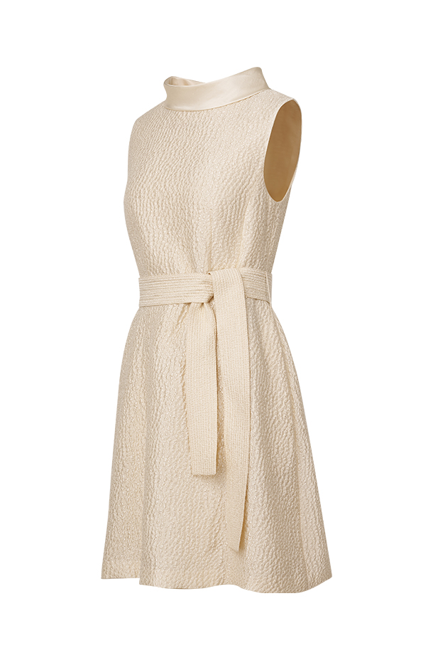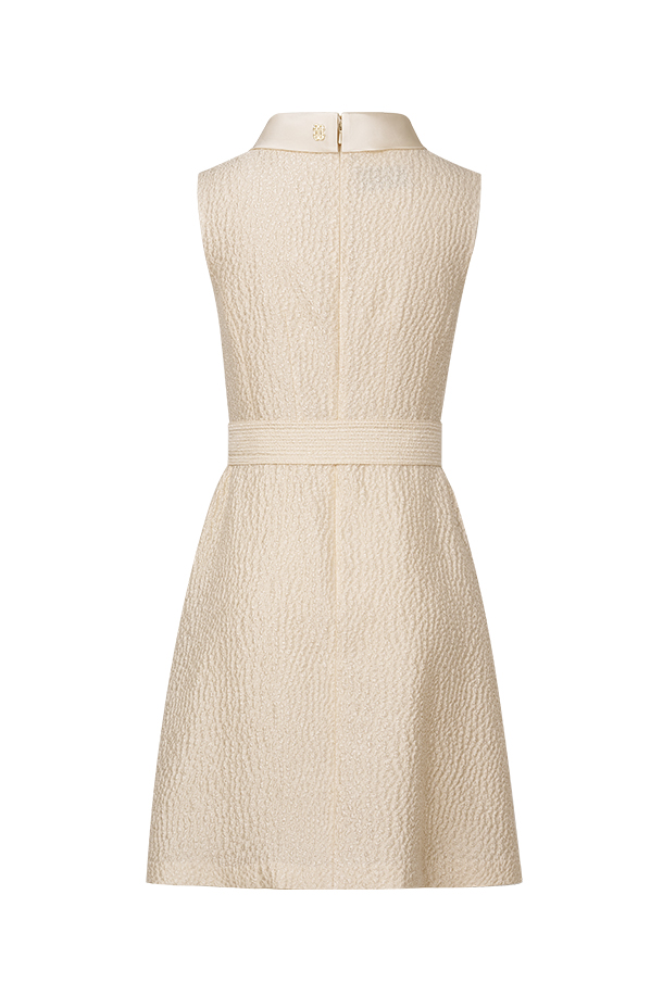 CURIEL's iconic short HEPBURN style dress with a turnover collar.· The fabric features a rippled texture with a pearlescent sheen.· A classic 1950s silhouette with clean, fluid lines.· A structured roll collar enhances the neck's graceful lines.