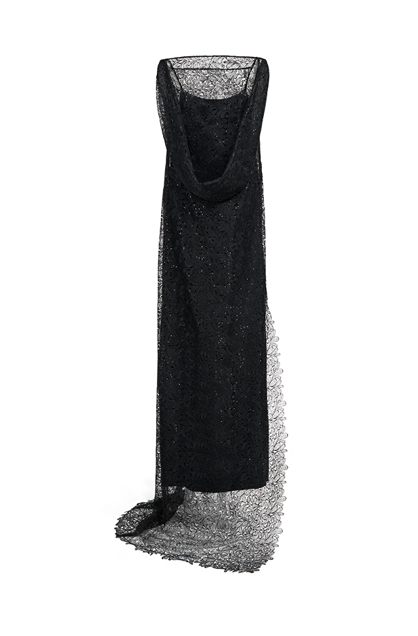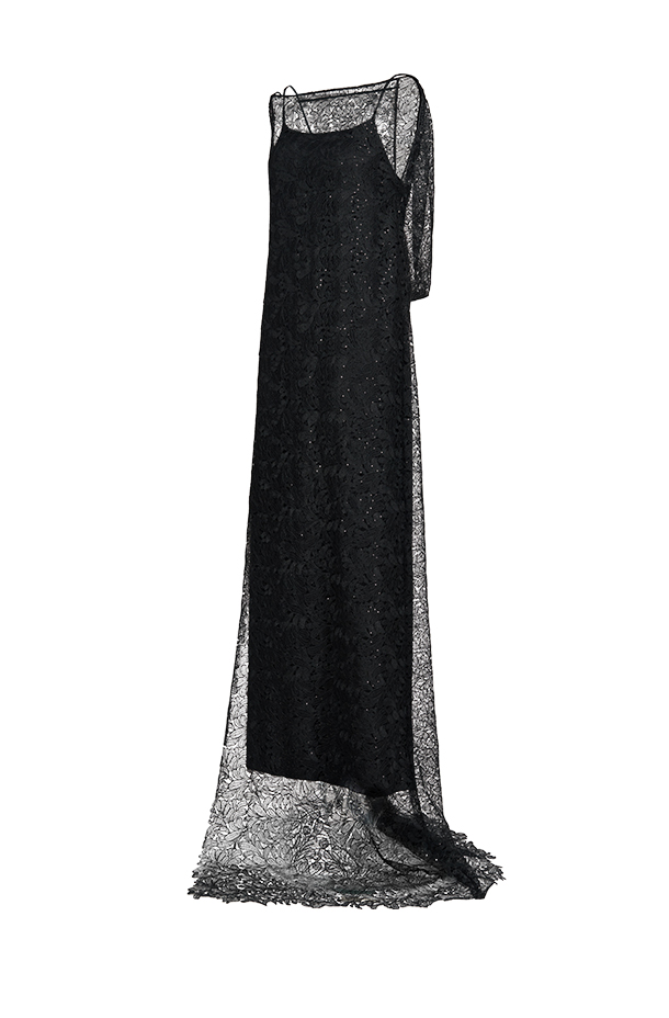 Delicate lace fabric, lightweight and romantic with distinct layers.