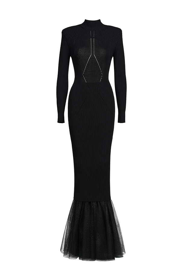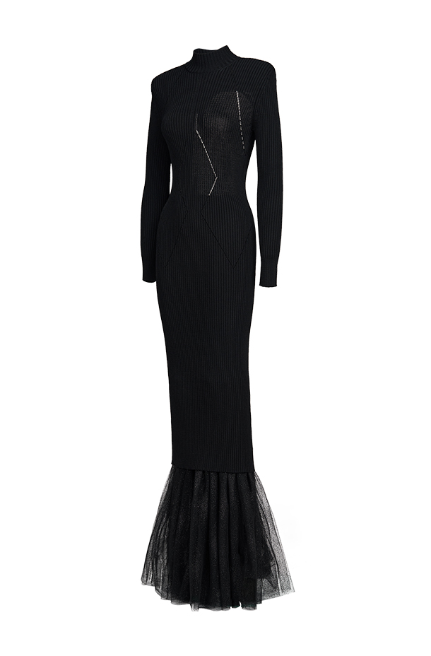 · Outer high-neck knit dress wearable alone, with back oval cutout for stylish allure.