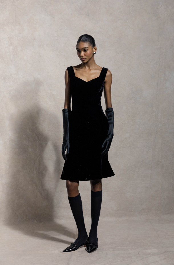 Hem lined with peony pink silk, creating a playful contrast with black velvet.