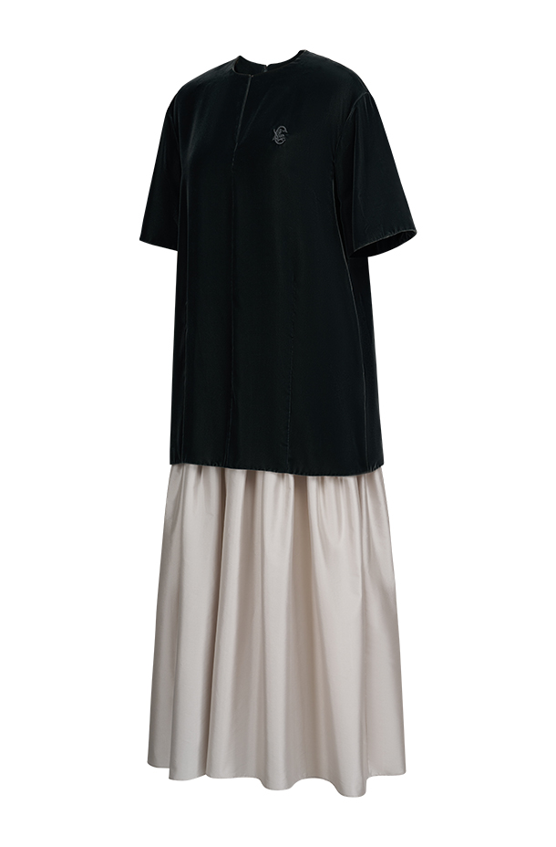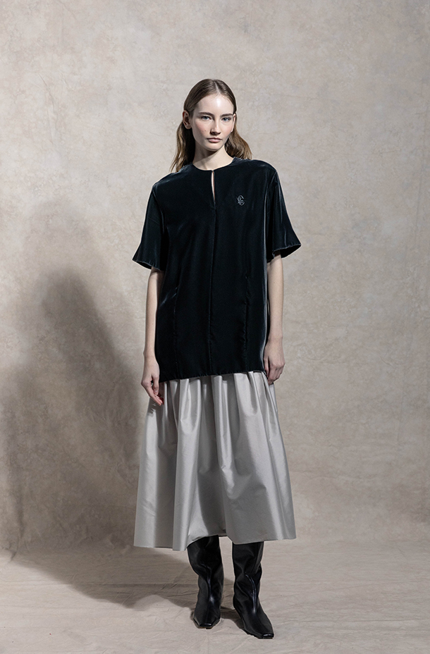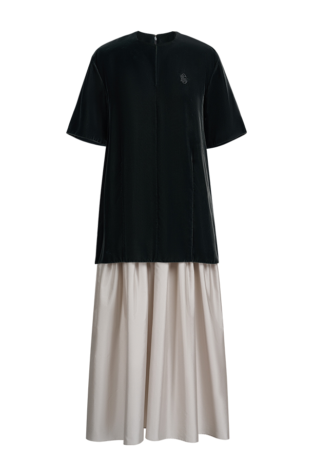 Dark gray and light gray color block, premium velvet blended with lightweight sateen cotton, distinct layers, unique mix-and-match style.