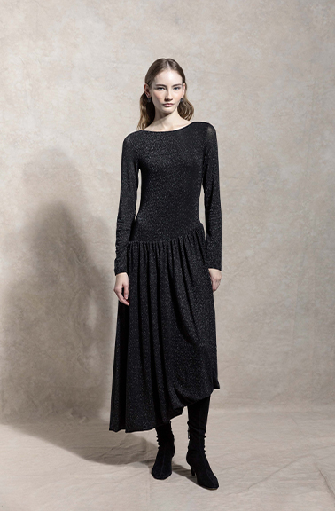 Lightweight knit fabric blended with silver yarn, shimmering in light, adds refinement.