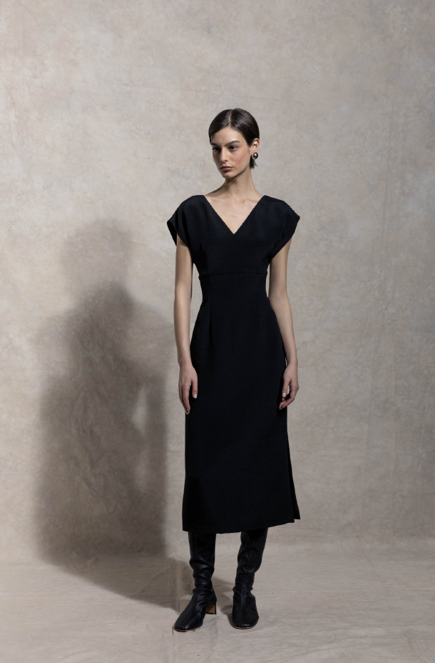High-grade silk-blend fabric, lightweight and soft, with natural drape that outlines an elegant figure.
