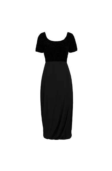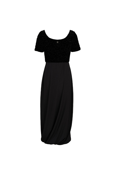 Pleated velvet bodice, smooth luster, presents dimensional layering.